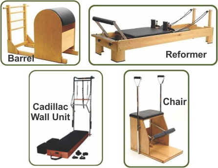 Os aparelhos como o Reformer, Chair, Barrel, Cadillac Wall Unit, Cadillac, Barrel meia-lua utilizam-se de molas e empenhaduras criando condições e graus de tensão e força, possibilitando o auxilio para pessoas com dificuldade ou restrição na execução dos exercícios como também na condição de tensão maior nas molas para quem precisa de uma maior tonificação.
